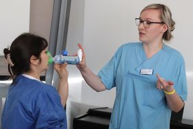 Kristina Valentinova Cholakova (l.) und Nele Grabowski demonstrierten die richtige Inhalationstechnik bei einem Asthma-Anfall.